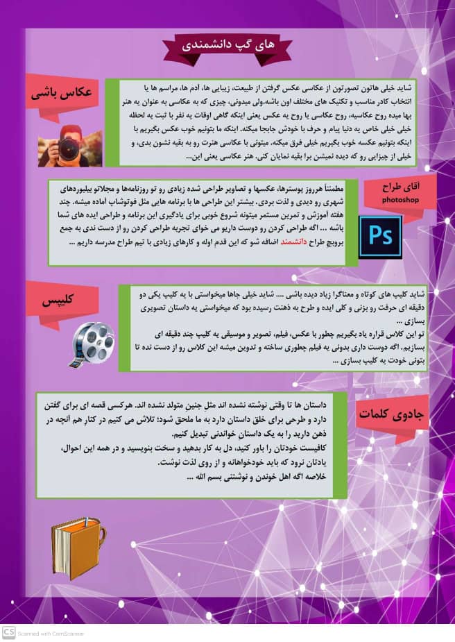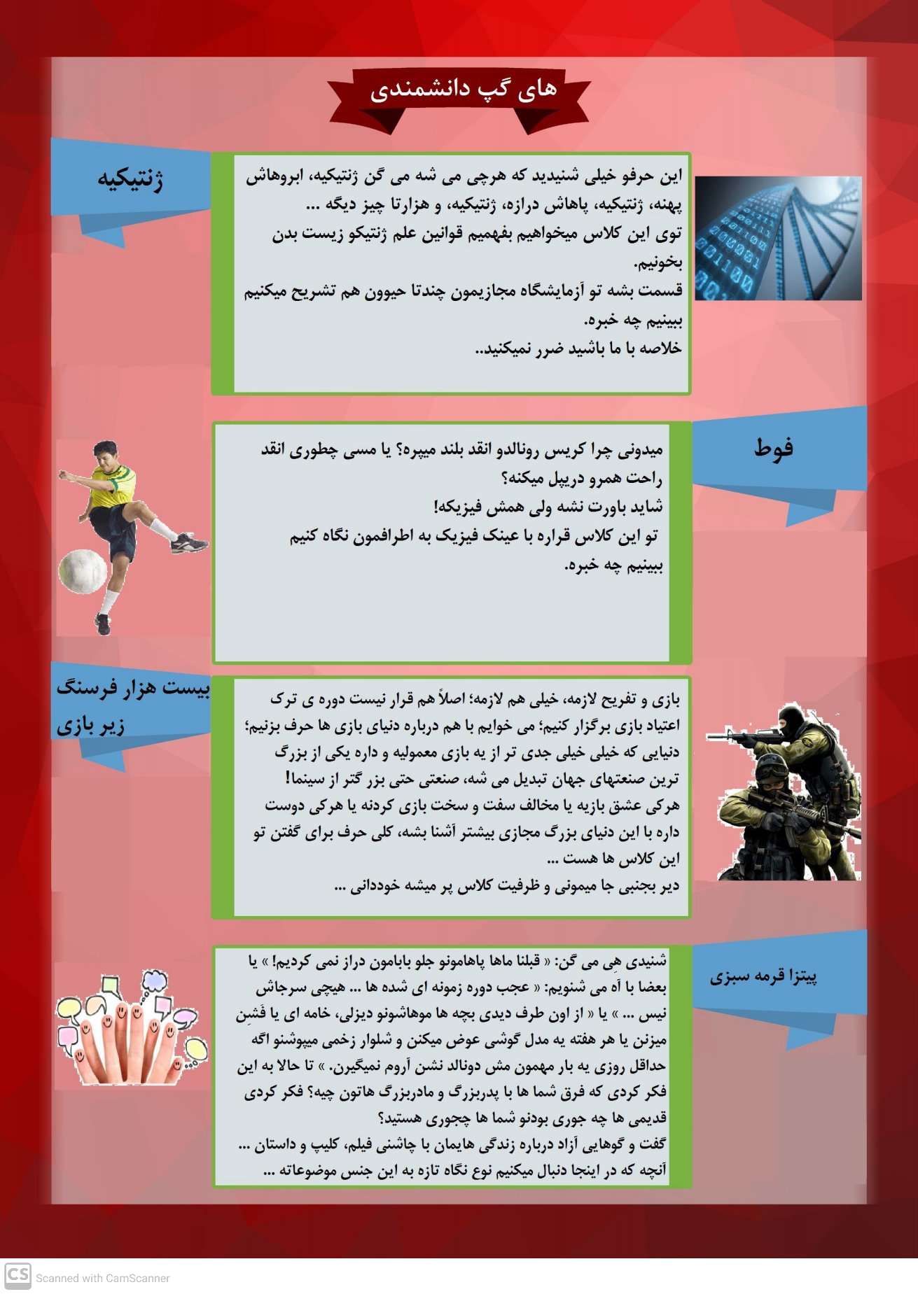 کلاسها و برنامههای ارائهشده در پایگاه تابستانی بر اساس انتخاب دانشآموزان از میان کلاسهای پیشنهادی که در فرم ((های گپ)) ارسال شده بود، انتخاب شدهاند. (کلاس های پیشنهادی را می توانید در انتهای صفحه مشاهده فرمائید)